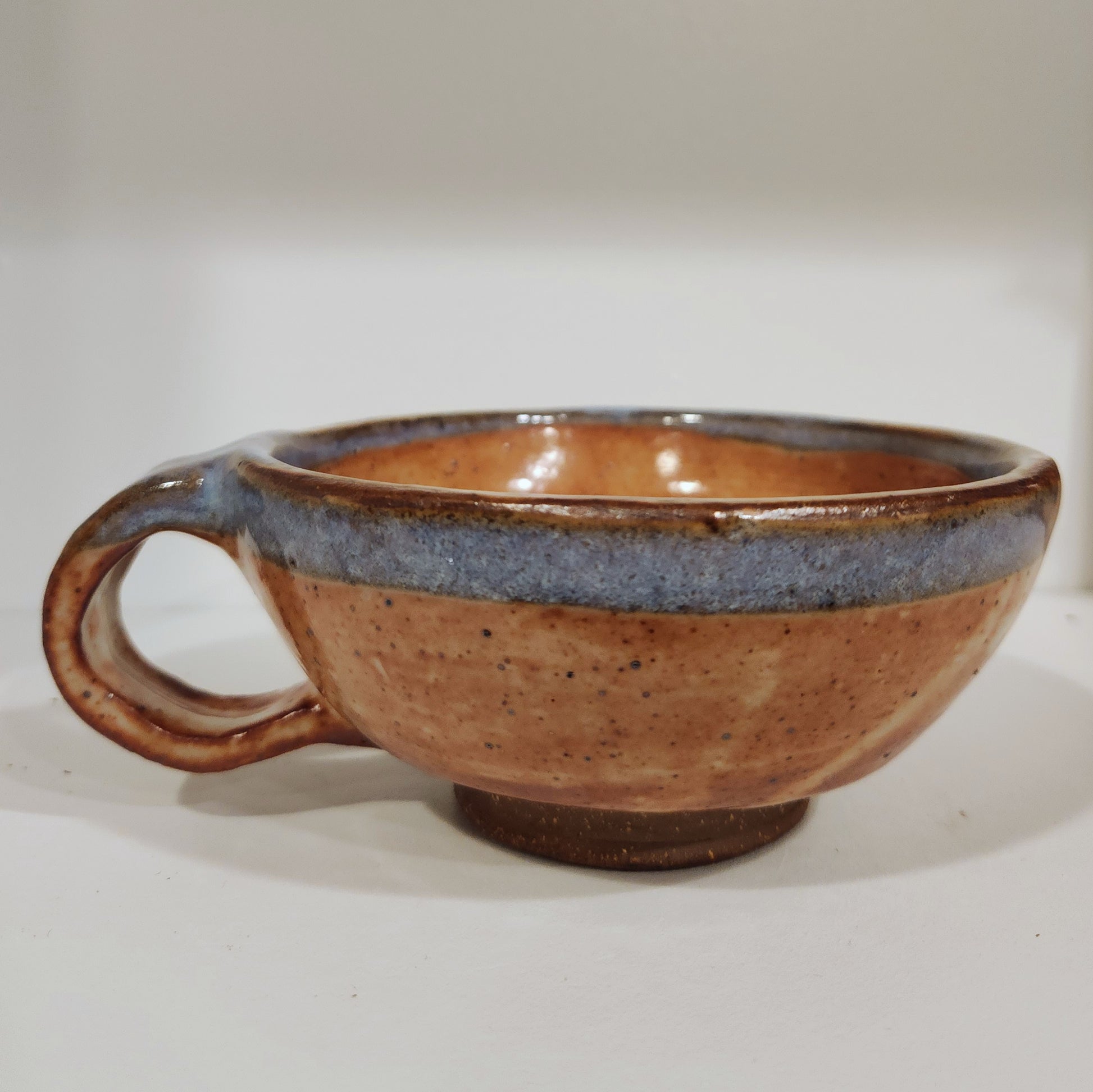 A one-of-a-kind, wide rimmed and somewhat shallow mug in a fiery sand color with an iridescent lavender rim